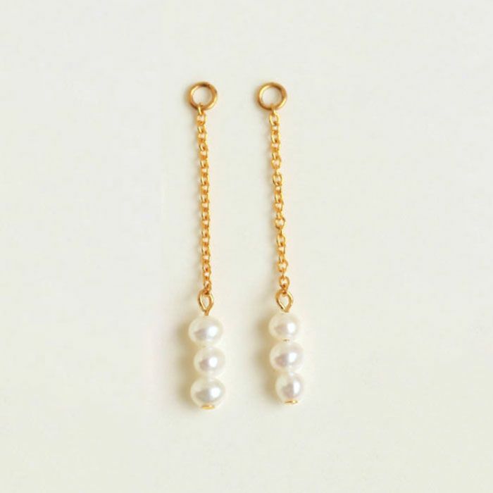 3つ並んだ小粒の淡水パールは、スタイルをやさしい雰囲気に仕上げてくれそう。耳元で揺らめくチェーンは、顔を動かした時にきれいに落ち着いて見えるように長さにもこだわりました。