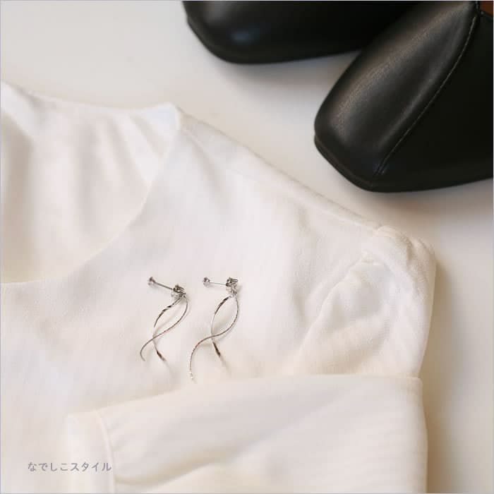 しっかりとした地金ウェーブは、見た目よりも軽いんですよ。 片耳の重さは「0.5g」。ピアスホールに負担がかからないように なるべく軽くなるように、なでしこスタッフ全員で検討を重ねました。