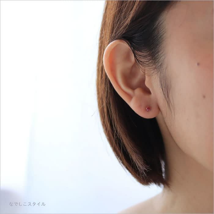 今回、思い切ってルビーのピアスを購入しました。年齢も50代後半なのでルビーのピアスは派手にならないかと思っていたのですが派手な感じもなく今の季節に差し色として着けています。 なでしこさんのピアスはアレルギーが出なくて安心して着ける事ができます。