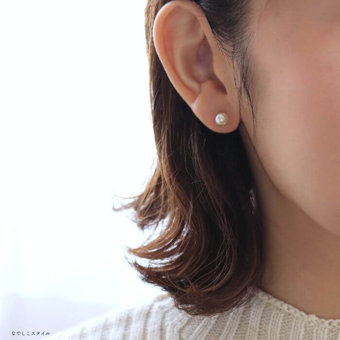 - 髪をまとめる日やショートヘアの日に。 耳がすっきり見える分、3mmの一粒がぽつんと映えて顔まわりのポイントに。