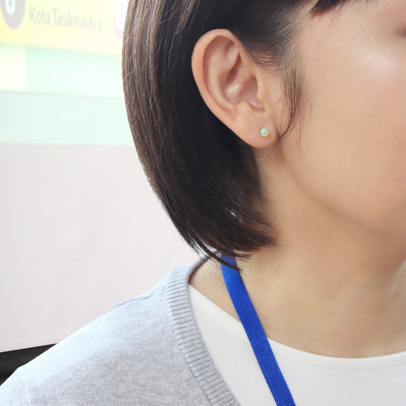 ほんのり黄色のやさしい色合いが、光の加減で表情が変わるところがこのピアスの魅力。