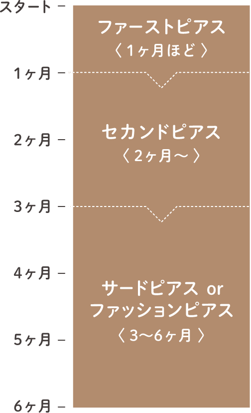 ピアスホールが完成するまでの間、ピアスはつけたまま。この時期は皮膚も薄く、一番アレルギーになる心配が 。...なるべく、安心できる素材のセカンドピアスで過ごしてください。早い方は2ヶ月くらい、お肌の弱い方は1年くらい掛かります。