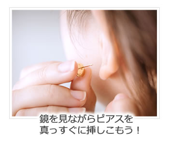 まず、鏡を見ながらピアスをピアスホールに真っすぐ通してみよう。