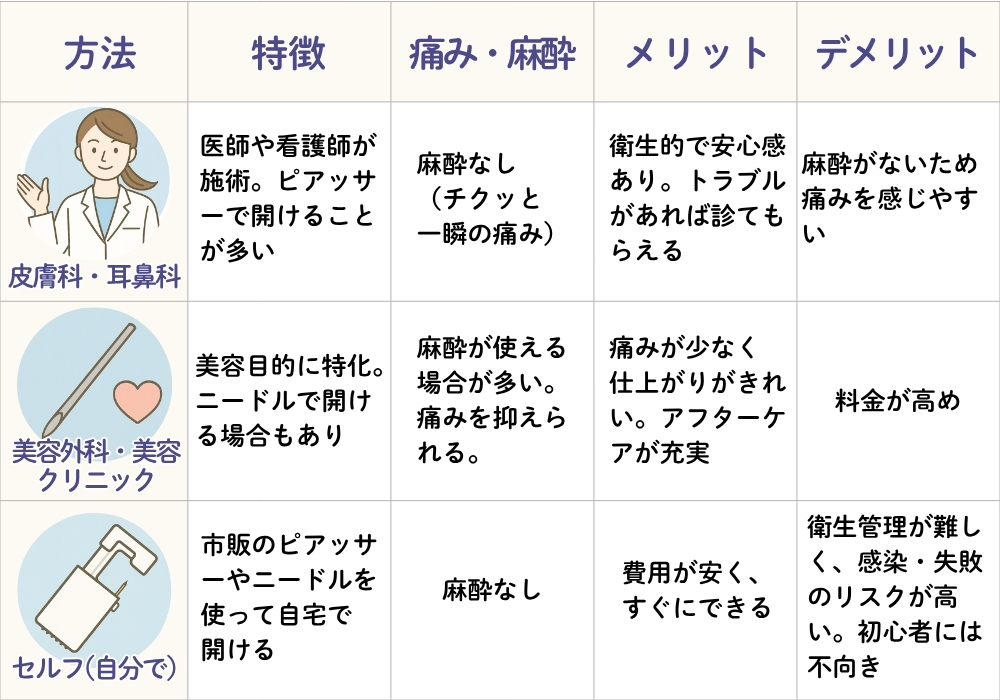 ピアスを開ける方法はいろいろあるけど、それぞれにメリットと注意点があるんだよ。